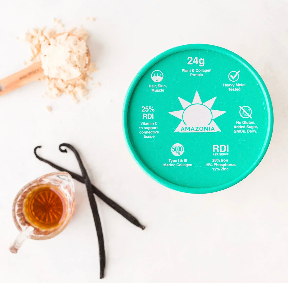- 每份含有高達5000mg的水解海洋膠原蛋白,還有24g有機發芽發酵植物性蛋白