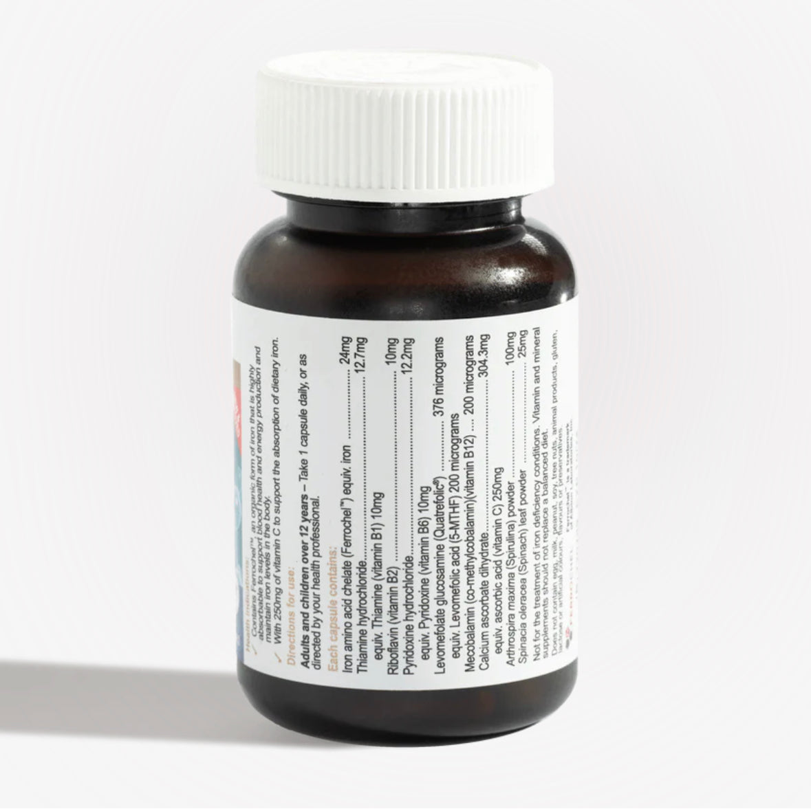 - 此款配方含有維他命C,幫助鐵質吸收。還含有富含鐵質的螺旋藻及藍綠藻。