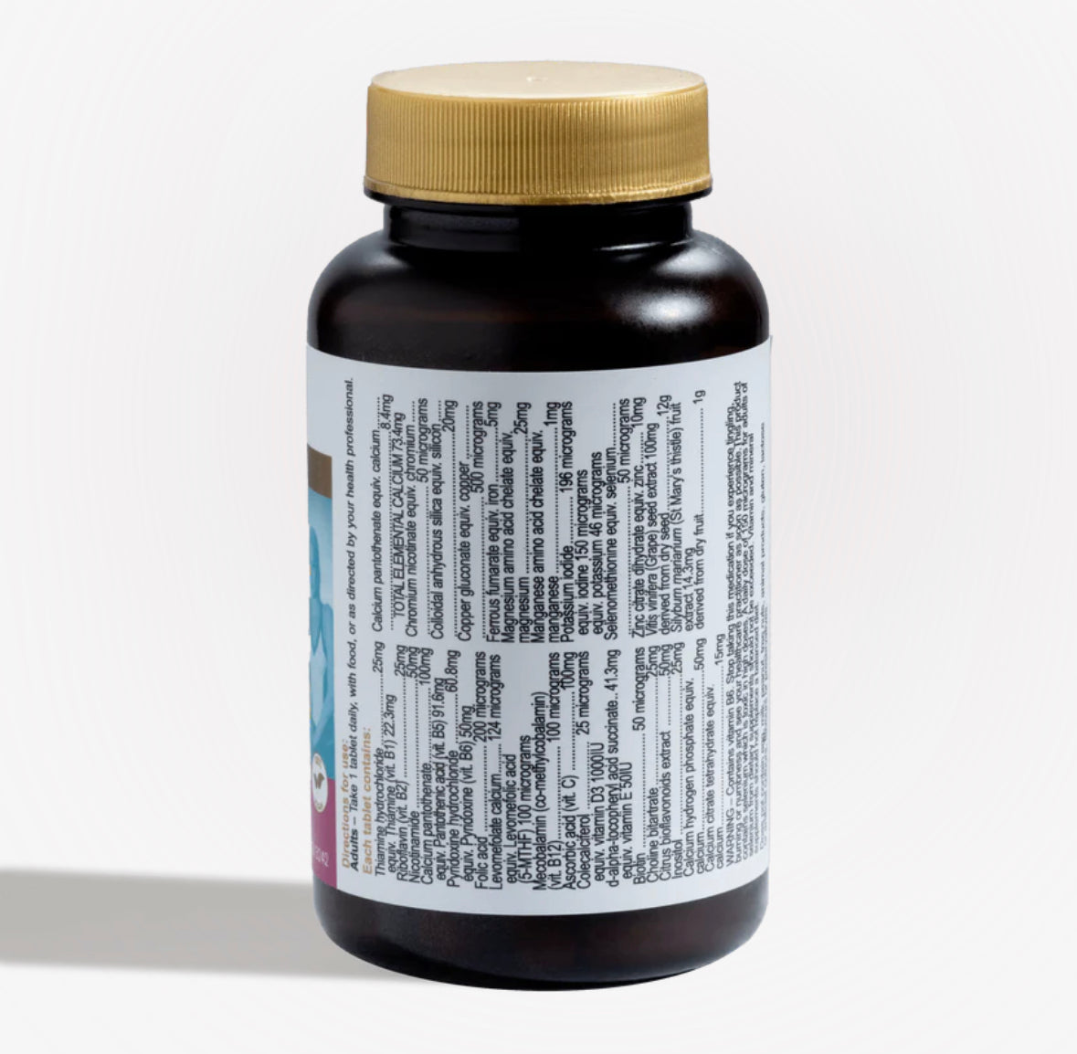 維生素B1,維生素B2,維生素B3,維生素B6,葉酸,左旋葉酸,維生素B12,維生素C,維生素D3,維生素E,生物素,膽鹼,柑橘類黃酮,肌醇,磷酸氫鈣,檸檬酸鈣,泛酸鈣,煙酸鉻,二氧化矽,葡萄糖酸銅,鐵,鎂,錳,碘,硒,鋅,葡萄籽,水飛薊。